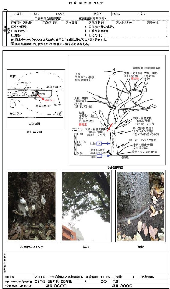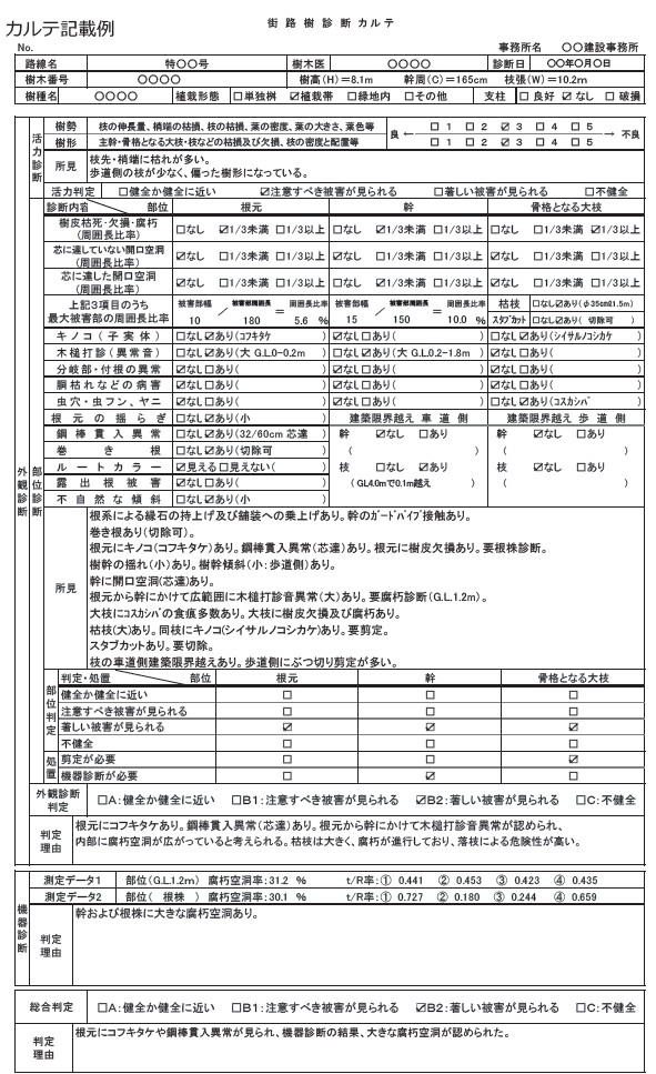 外観診断終了後に以下のフォーマットの街路樹診断カルテを記載し提出いたします。