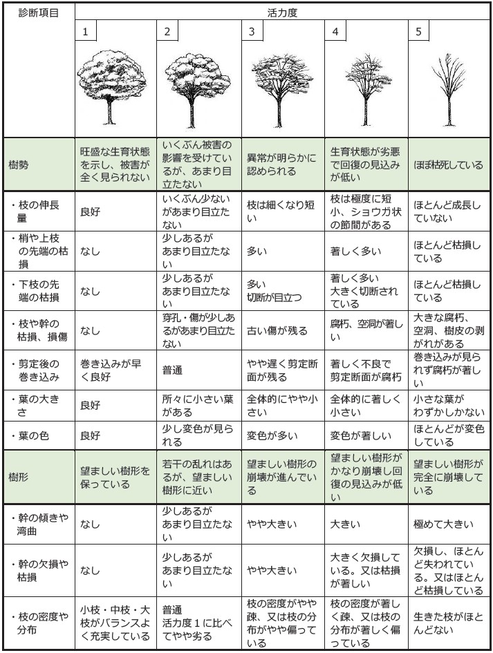 活力診断では、以下表にに示す樹勢・樹形の活⼒度診断基準表を用い、樹木の活⼒状態を、樹勢及び樹形によって診断しています。
