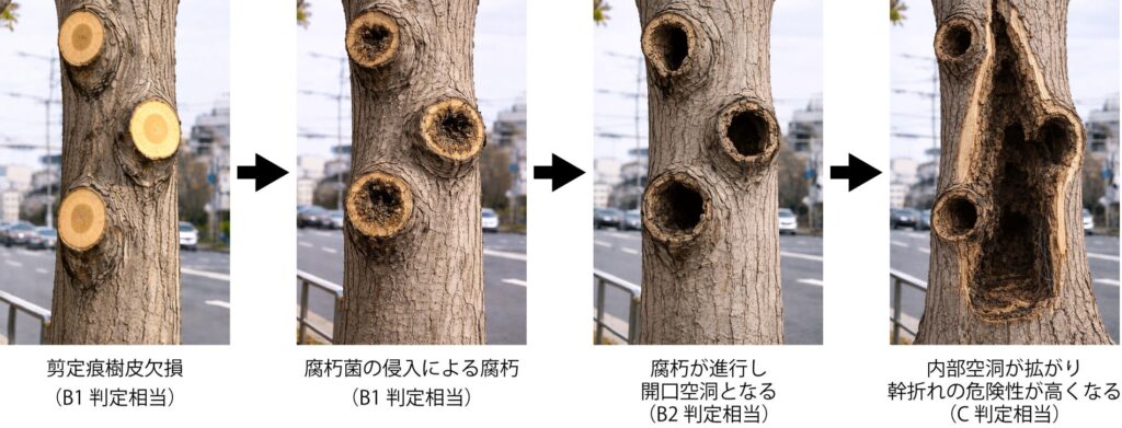 模式的な画像をもとに剪定痕から危険木に変化する様子を説明すると、
